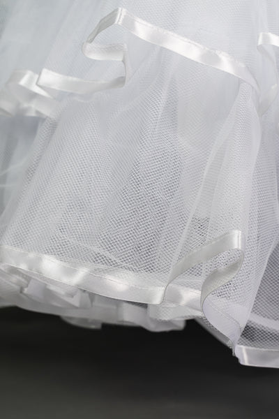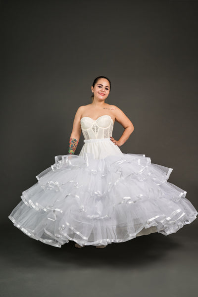 Crinolina elaborada con más de 8 capas de tull, elabora el trabajo de 4 crinolinas de tulle española juntas. Comodidad y un vuelo espectacular en vestidos con gran volumen de tela, ideal para vestidos muy pesados (como los tipos charros). Cuenta con resorte y listón en la parte de la cintura para garantizar su comodidad y un bordado finamente detallado en el borde del tull.